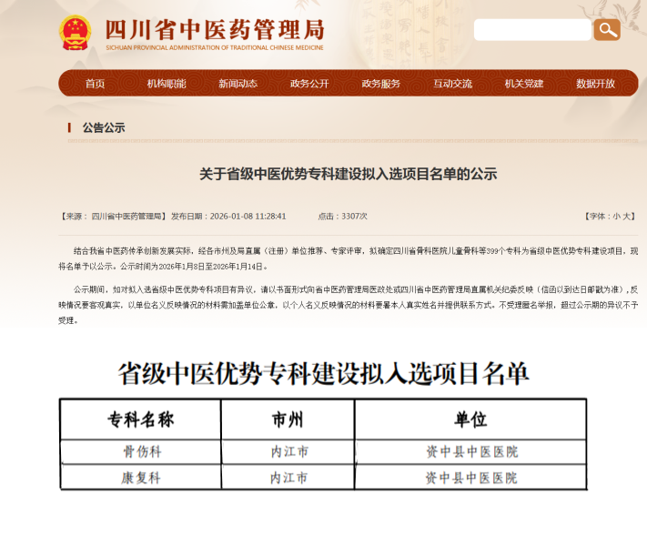 近日四川省中医药管理局官网发布了关于省级中医优势专科建设拟入选项目名单的公示其中资中县中医医院骨伤科、康复科成功入选。这既是对两科室综合实力的肯定,也将成为我院强化重点专科建设提升中医药服务能力的全新起点。