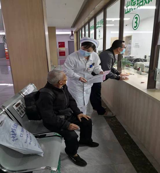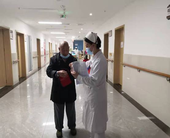 2021年10月25日下午3:00,8床高龄患者刘天清家属未在身边,需要办理转院手续,家属因为疫情原因不能进入病区,护士长余晓莉主动帮忙办理转院手续及出院手续,由科室护工黄小兰护送其出院。