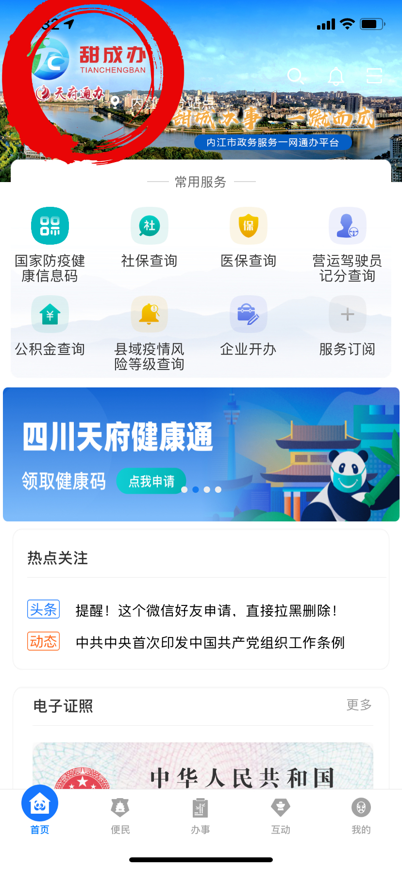 二、进入“天府通办”页面点击左上角“省本级”选择“内江市”