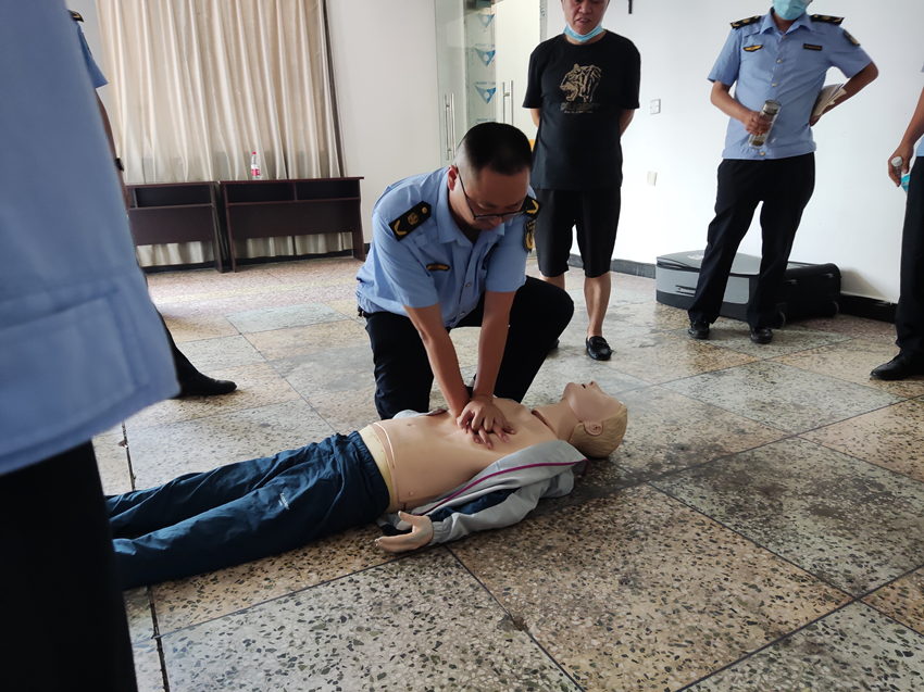 主治医师黄光垒深入浅出讲解中暑、溺水及心肺复苏知识,重点讲解中暑和溺水的紧急救治方法,以及心肺复苏的操作要点。护士鲍芳丽利用心肺复苏模拟人演示中暑、溺水紧急救治和心肺复苏全过程,直观地向执法队员展示急救流程和操作要领。
