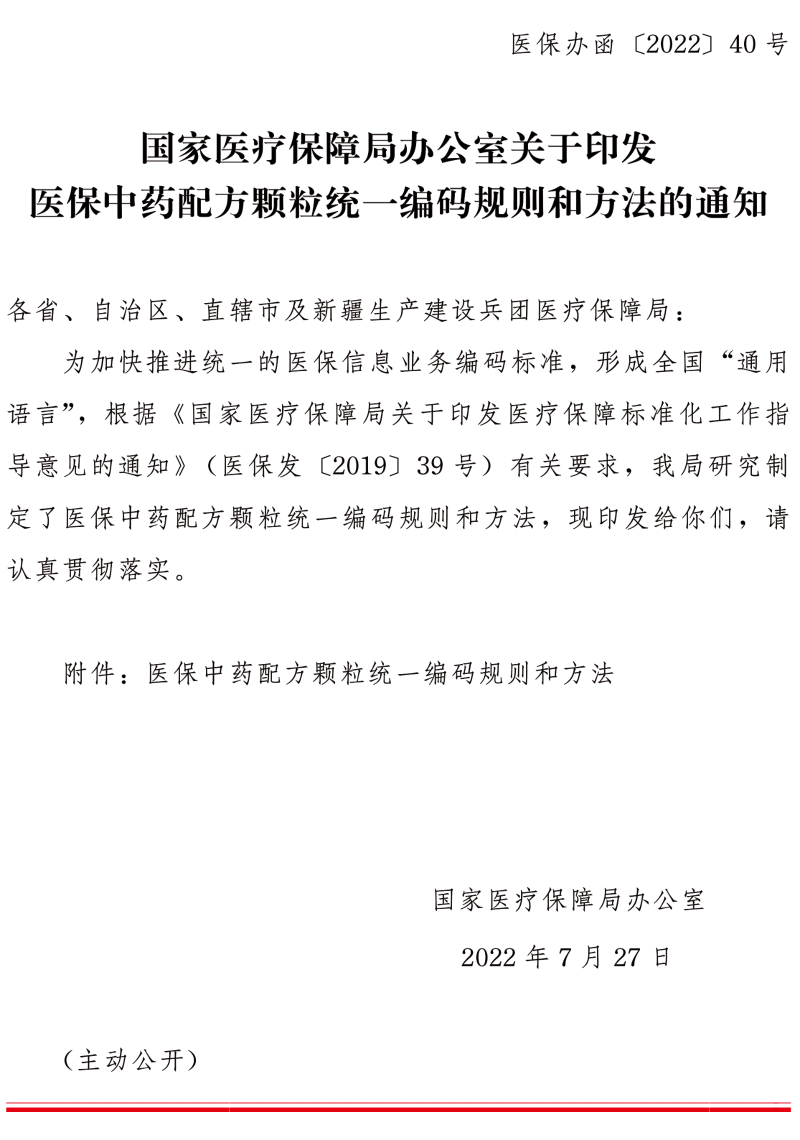国家医疗保障局办公室关于印发医保中药配方颗粒统一编码规则和方法的通知
