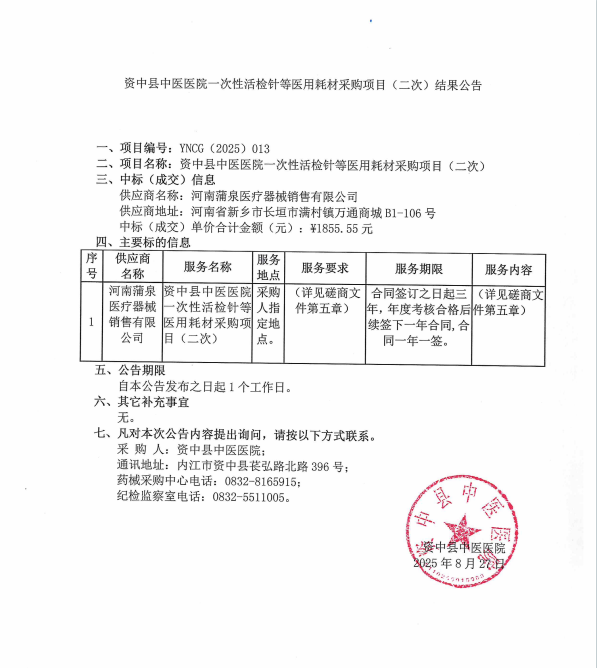资中县中医医院一次性活检针等医用耗材采购项目(二次)结果公告